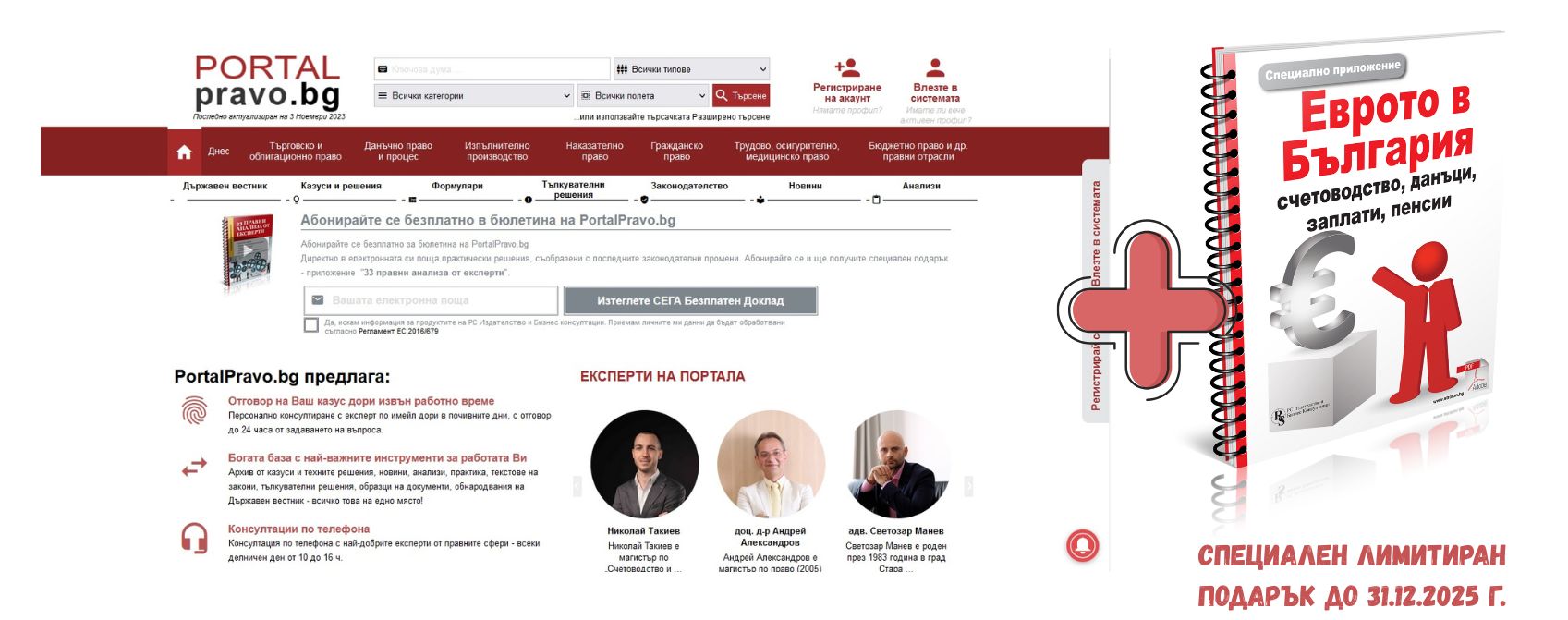 Внимание: Ако заявите абонамент към Портал Право до края на м. декември 2025 г., получавате и специален лимитиран подарък: "Еврото в България – счетоводство, данъци, заплати, пенсии" - pdf издание с важни и интересни съвети, решения и насоки!